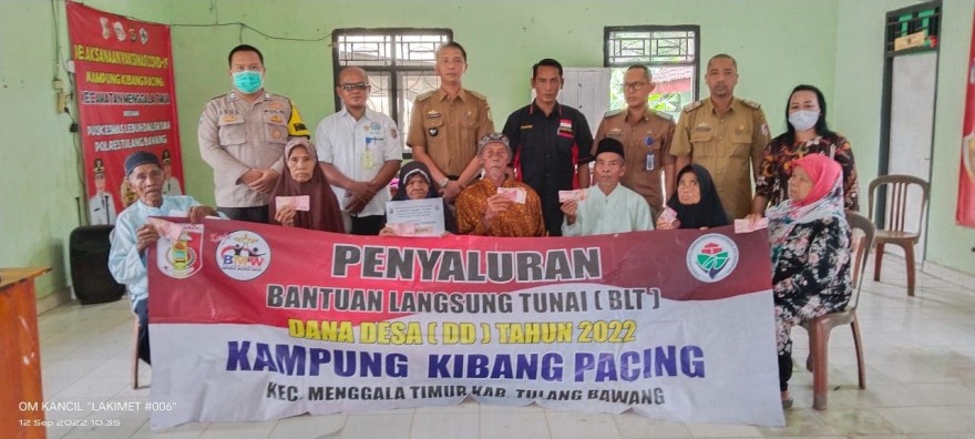 Seluruh Aparatur Kampung dan Perangkat Kampung Kibang Pacing Kecamatan Menggala Timur di dampingi Babinkamtibmas, Pendamping Desa, Pendamping Lokal Desa, serta Perwakilan Camat Menggala Timur Membagikan BLT-DD Bulan Juli s/d September sebesar Rp. 900.000 / KPM sebanyak 95 KPM BLT-DD.