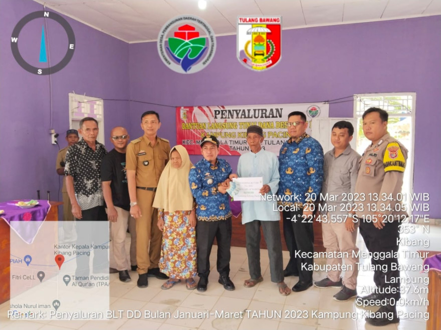 Pembagian BLT Dana Desa, berlangsung di Balai Kampung Kibang Pacing dihadiri Camat Menggala Timur Bpk Agus Wandi,SH.,MH, Kepala Kampung Kibang Pacing Inci Fachruriza,SH. Ketua BPK Bpk Muhadi, PD Bpk Harnawan Perangkat Kampung, Bhabinsa Bpk EKO WINARDI, Babinkamtibmas Bpk. Brigpol Agus Setiawan.