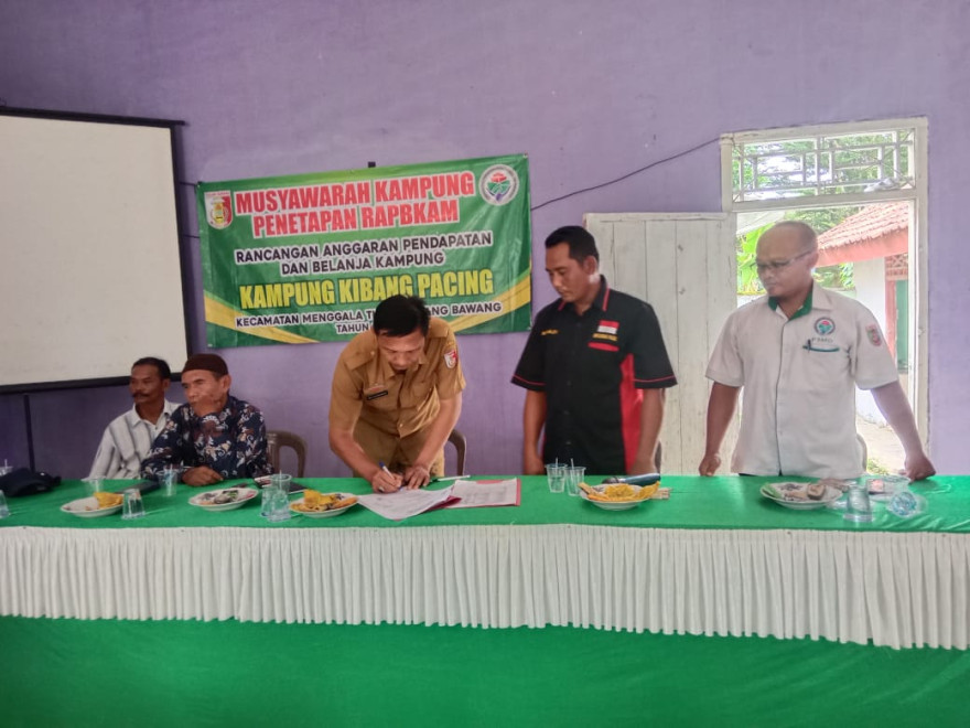 Hasil dari rapat dilakukan penandatanganan berita acara RAPBKAM Kibang Pacing tahun Anggaran 2024. Pelaksanaan Musyawarah terkait penetapan Rancangan Anggaran Pendapatan dan Belanja Kampung (RAPBKam) Tahun Anggaran 2024.